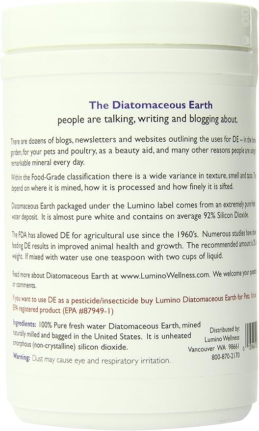 - Diatomaceous Earth packaged under the Lumino label comes from an extremely pure fresh water deposit